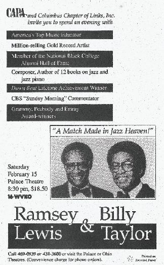 The Columbus (OH) Chapter of The Links, Incorporated hosts jazz pianist Ramsey Lewis and Billy Taylor in concert, raising funds for minority education programs.